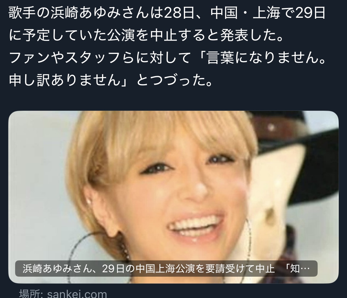 歌手の浜崎あゆみさんは28日、29日に予定していた中国・上海での公演を中止すると発表しました。X (formerly Twitter)