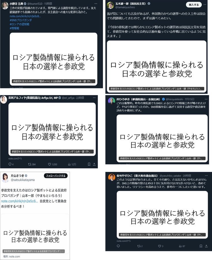 その後、この分析を引用する形で、 玉木雄一郎氏、河野太郎氏、片山さつき氏をはじめとした与野党の国会議員が「ロシア製偽情報」「ロシアボット」などの表現を使いながら、一斉に疑惑を拡散しました。 結果として、 「参政党=ロシアのボットに操られている政党」 というイメージだけが、SNS上で先行して広まることになりました。